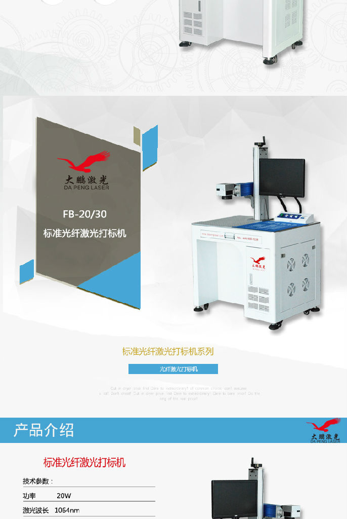机型特点:*优异的光束质量下*免维护操作,非接触加工,加工效率高,采用计算机控制,易于实现自动化。*稳定性好,脉冲频率高,雕刻线条均匀。图案精细,雕刻深度能力强。光纤激光器采用高功率多模激光二极管为泵浦源, 掺镜双包层光纤作为激光介质,光束由光纤传输,经X、Y扫描镜片控制光束的高速运动(其速度是传统打标218倍以上),从而加工出精美的图案。光纤激光打标机是第三代激光打标机系统,运用了先进的激光技术,光纤激光打标机采用光纤 激光器输出激光,电光转换效率高,光束质量好,而且体积小、免维护,激光波长为1064nm,其稳定性好,脉冲频率高,雕刻线条均匀、图案精细;雕刻深度能力强。应用领域:广泛用于集成电路芯片,电脑配件,工业轴承,钟表,电子及通讯产品,家电,五金工具,模具,电线电缆,食用包装,首饰,等