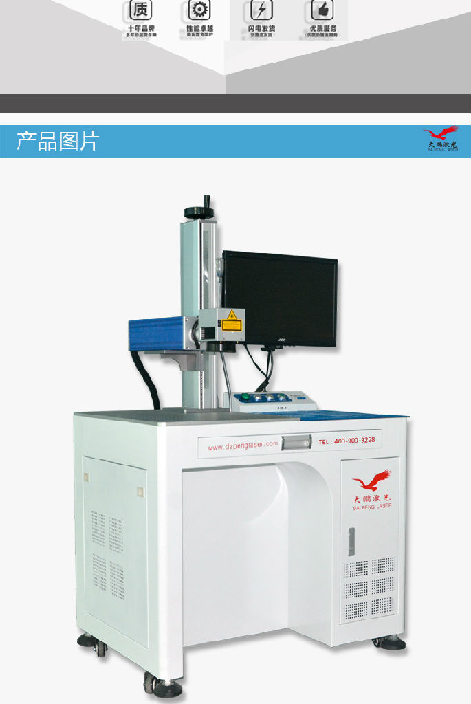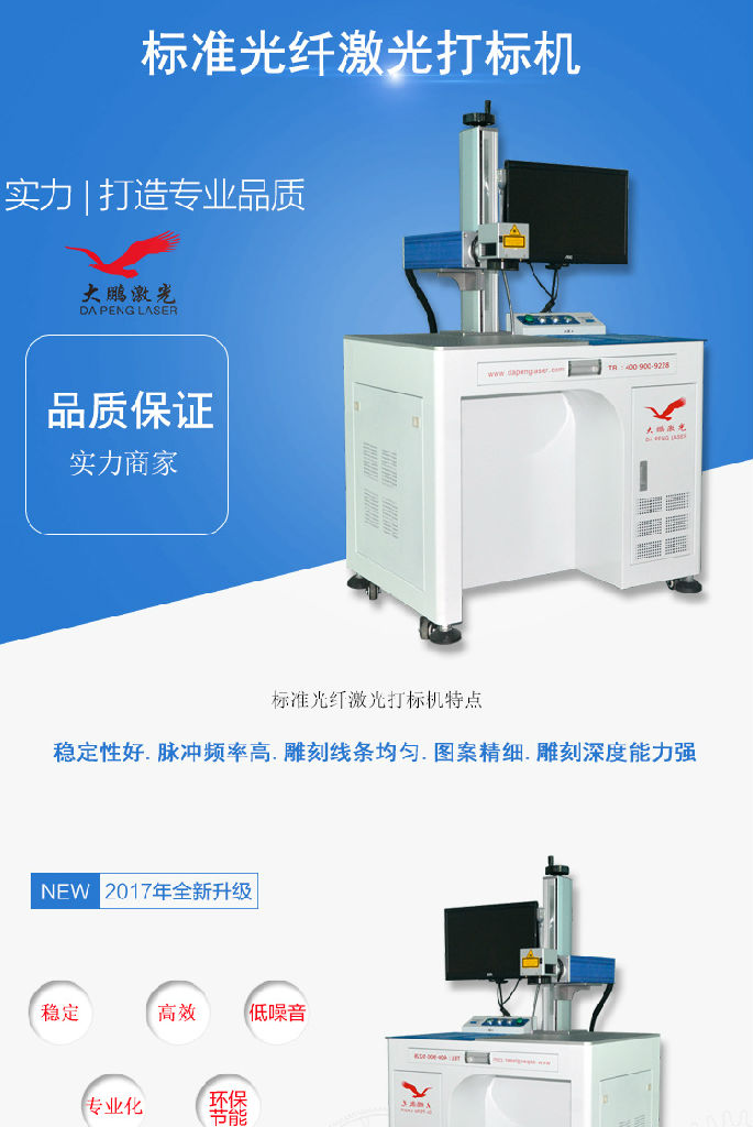 机型特点:*优异的光束质量下*免维护操作,非接触加工,加工效率高,采用计算机控制,易于实现自动化。*稳定性好,脉冲频率高,雕刻线条均匀。图案精细,雕刻深度能力强。光纤激光器采用高功率多模激光二极管为泵浦源, 掺镜双包层光纤作为激光介质,光束由光纤传输,经X、Y扫描镜片控制光束的高速运动(其速度是传统打标318倍以上),从而加工出精美的图案。光纤激光打标机是第三代激光打标机系统,运用了先进的激光技术,光纤激光打标机采用光纤 激光器输出激光,电光转换效率高,光束质量好,而且体积小、免维护,激光波长为1064nm,其稳定性好,脉冲频率高,雕刻线条均匀、图案精细;雕刻深度能力强。应用领域:广泛用于集成电路芯片,电脑配件,工业轴承,钟表,电子及通讯产品,家电,五金工具,模具,电线电缆,食用包装,首饰,等