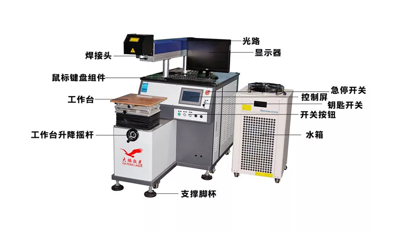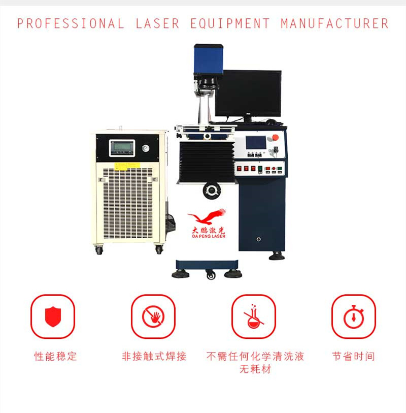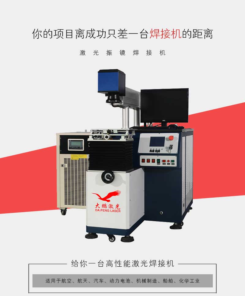 机器特点:* 在单点焊接时由于的减少了空程定位时间,生产效率比普通激光点焊工效提高4—10倍;* 由YAG固体激光器、激光电源、光学扫描系统、三维可调节工作台、工控机系统、制冷系统、激光指示系统,操作机柜等组成;* 提供基于windows平台下的专用激光焊接软件;* 焊接点或图形可在其专用软件中直接输入、编辑,也可由Auto CAD、Corel DRAW等其它软件编辑,再通过其专用软件导入进行处理。应用范围:主要应用于手机屏蔽罩、金属手机外壳、金属电容器外壳、电脑内金属屏蔽网、剃须刀片、电子接插件及其它类别电子产品的高效率激光点焊或密封焊。产品优势:焊接速度是传统电动十字工作台几倍;精度高、质量稳定、操作方便、维护简单等优点;特别适用各种零部件的激光精密点焊; 生产效率达到普通激光点焊机的8倍左右。
