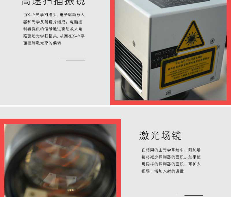 机器特点:* 优异的光束质量;* 免维护操作,非接触加工,加工效率高,采用计算机控制,易于实现自动化;* 稳定性好,脉冲频率高,雕刻线条均匀、图案精细,雕刻深度能力强。应用领域:广泛运用于集成电路芯片、电脑配件、工业轴承、钟表、电子及通讯产品、航天航空器件、家电、五金工具、模具、电线电缆、食品包装、首饰、烟草及军事用途等众多领域图形和文字的标记。产品优势:* 采用高功率多模激光二极管为泵浦源,掺镜双包层光纤作为激光介质,光束由光纤传输,经X、Y扫描镜片控制光束的高速运动(其速度是传统打标机的3倍以上);* 可兼容CorelDRAW、AutoCAD、Photoshop等软件的文件;* 支持PLT、PCX、DXF、 BMP、JPGE等,可直接使用SHX、TTF字库;* 支持自动编码、打印序列号、批号、日期、条形码、二维码自动跳号等。