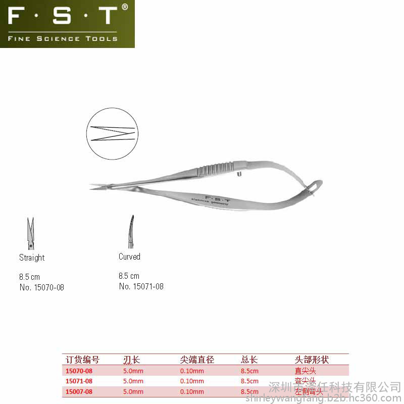 | Vannas 弹簧剪(微齿)-直/8.5cm | 直/带齿尖&尖头直径0.1mm/刃长5mm/8.5cm长 | F.S.T/Canada | 15070-08 |