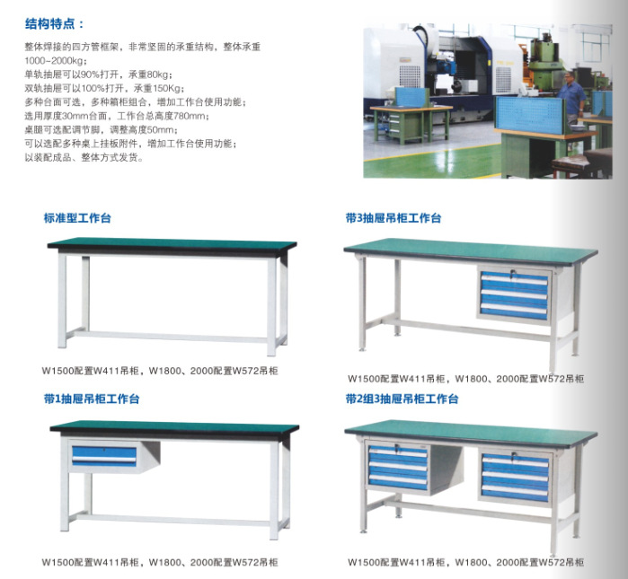 | 规格 | 1200*600*800工作台,1500*750*800工作台,1800*750*800工作台,2000*750*800工作台,1抽工作台吊柜,2抽工作台吊柜,3抽工作台吊柜,4抽落地柜 |
