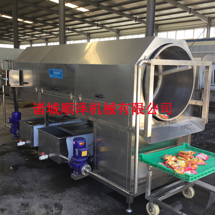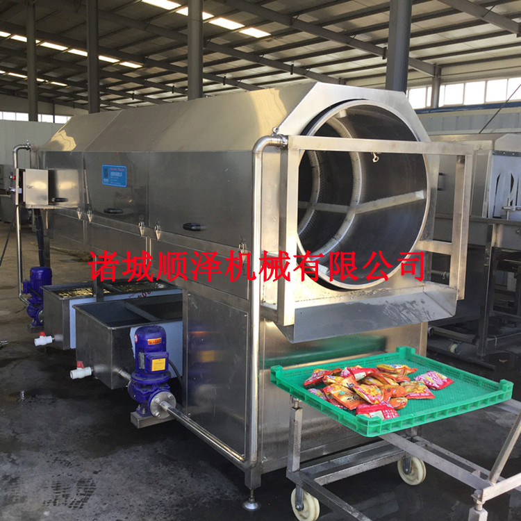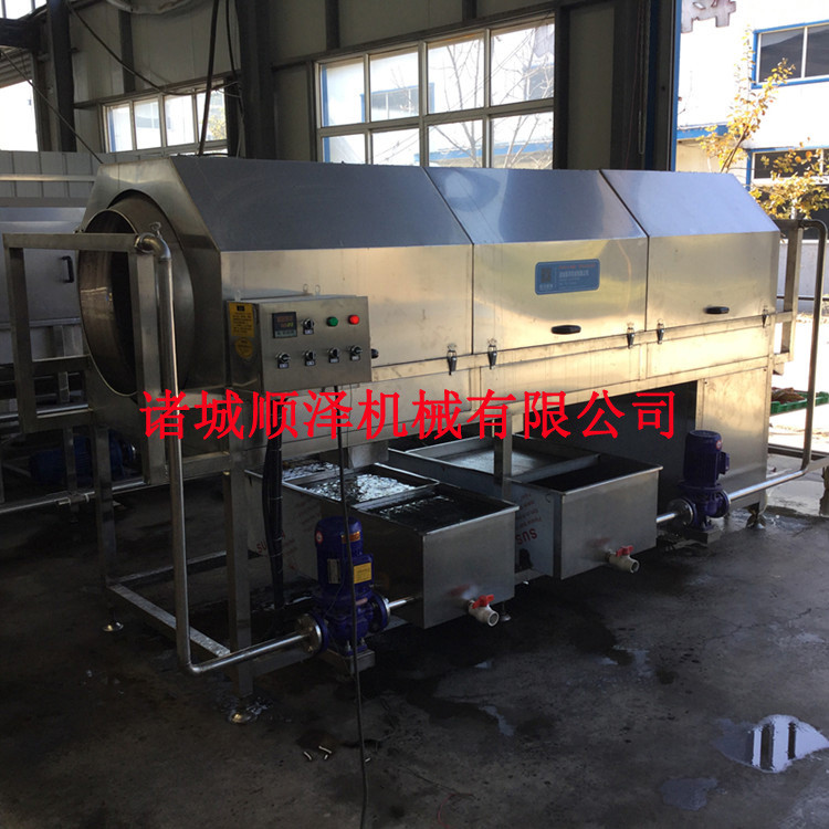 该设备由减速机、水泵、滚筒、支架、托轮、喷淋水管、料斗、盖板、水箱、阀门、传动轴、电机架、电气控制开关等一些零部件组成。通过链条由电机链轮带动长轴上链轮,再由过渡轴的链轮和滚筒上的不锈钢链条啮合而使滚筒实现转动。物料进入滚筒后通过喷淋管冲洗以及滚筒翻转滚动达到清洗效果,滚筒下方有水箱,靠近进料的清水水箱,进水管接清水,靠近出料边有污水排出口。