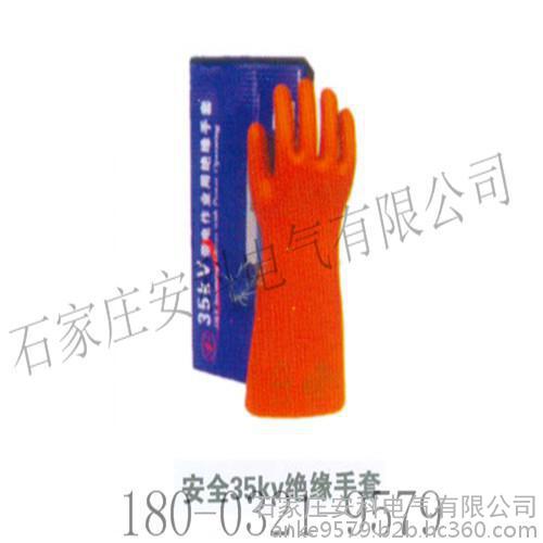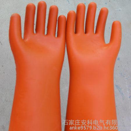 2·耐12kV的绝缘橡胶手套:用绝缘橡胶片模压硫化成型的五指手套,为米黄色、褐色、质地柔软、耐曲折。规格有380型,即全长380mm(10mm,中指长85mm(5mm;350型,全长350mm(10mm,中指长82mm(5mm。两种型号的手掌面、厚度均为1.8mm(0.3mm,筒掌长厚度为1.4mm(0.3mm。适合于电力工业以及工矿企业中操作高低压电力设备时戴用。这种手套在使用电压1000V以上的高压区作业,只能作辅助安全防护用品,不得接触有电设备。