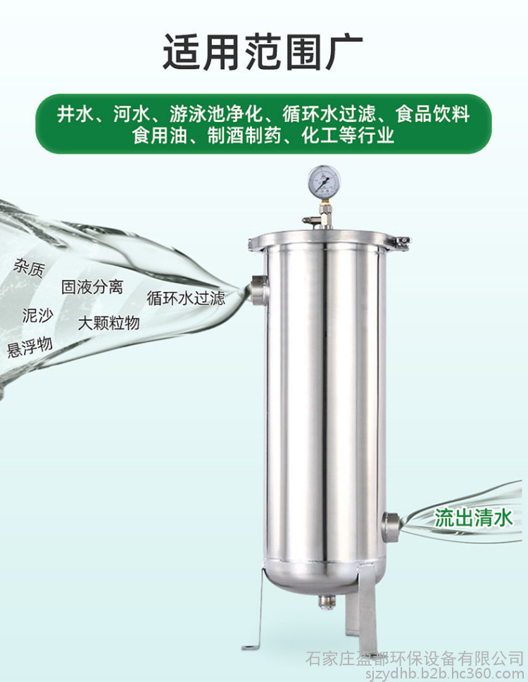 精密过滤器广泛用于饮用纯水、生活用水、电子、印染纺织、环保、医药等行业的用水过滤、酒精过滤、药业过滤、酸碱过滤、反渗透电渗析、超滤的进水保安过滤。