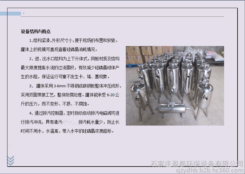 1、结构紧凑,外形尺寸小,便于现场的布置和安装。罐体上的视镜可直观查看硅磷晶消耗情况。 ??