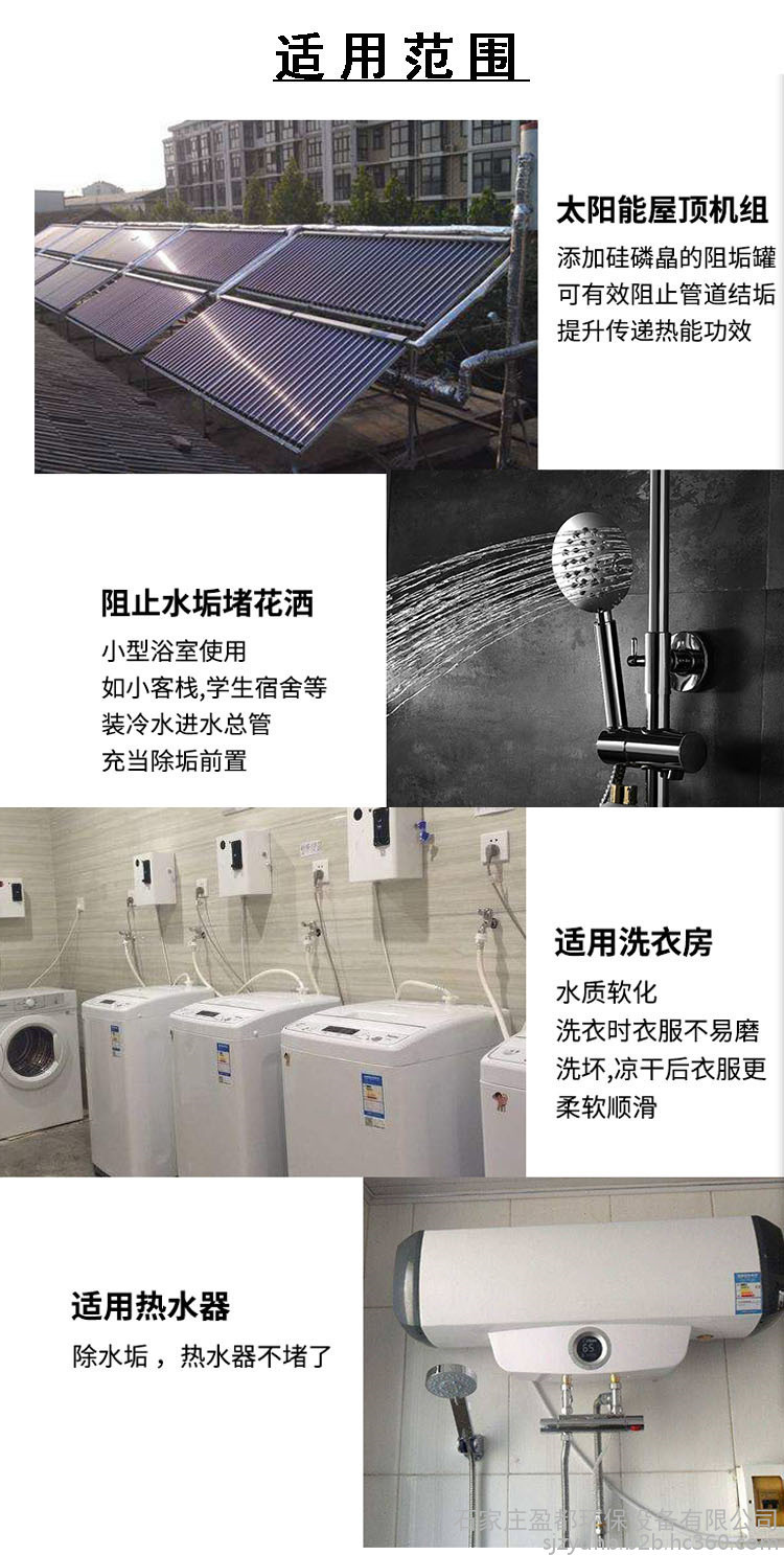 1.个人家庭系统:家庭烧水壶、太阳能(空气能)热水器、净水器(机)、开水器、家庭取暖(水暖)设备、小型锅炉等生活用水设备,防止结垢、腐蚀生锈,解决红锈黄水现象,改善用水条件,提高给水品质。