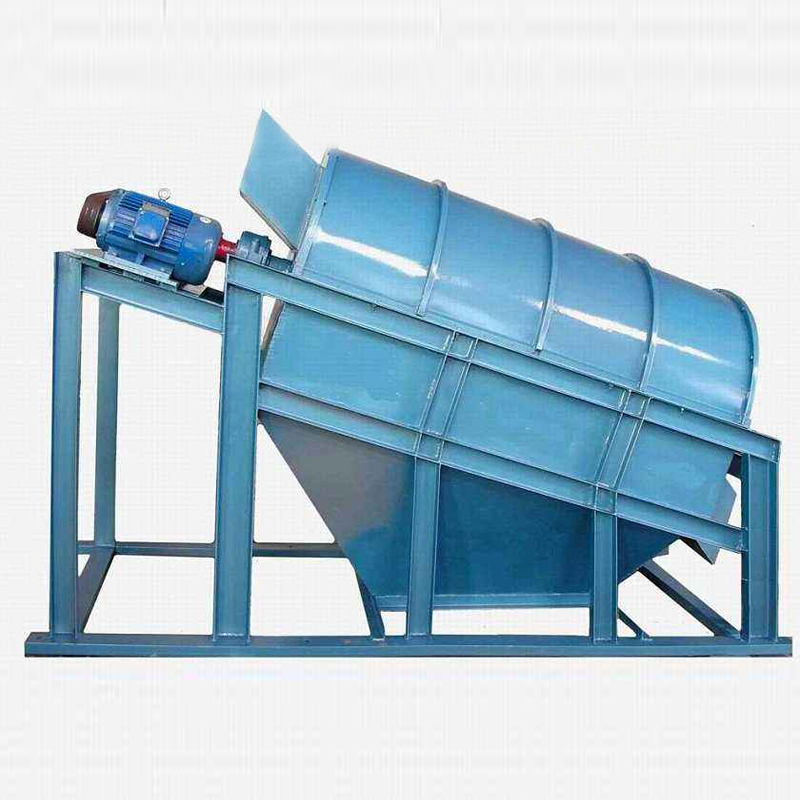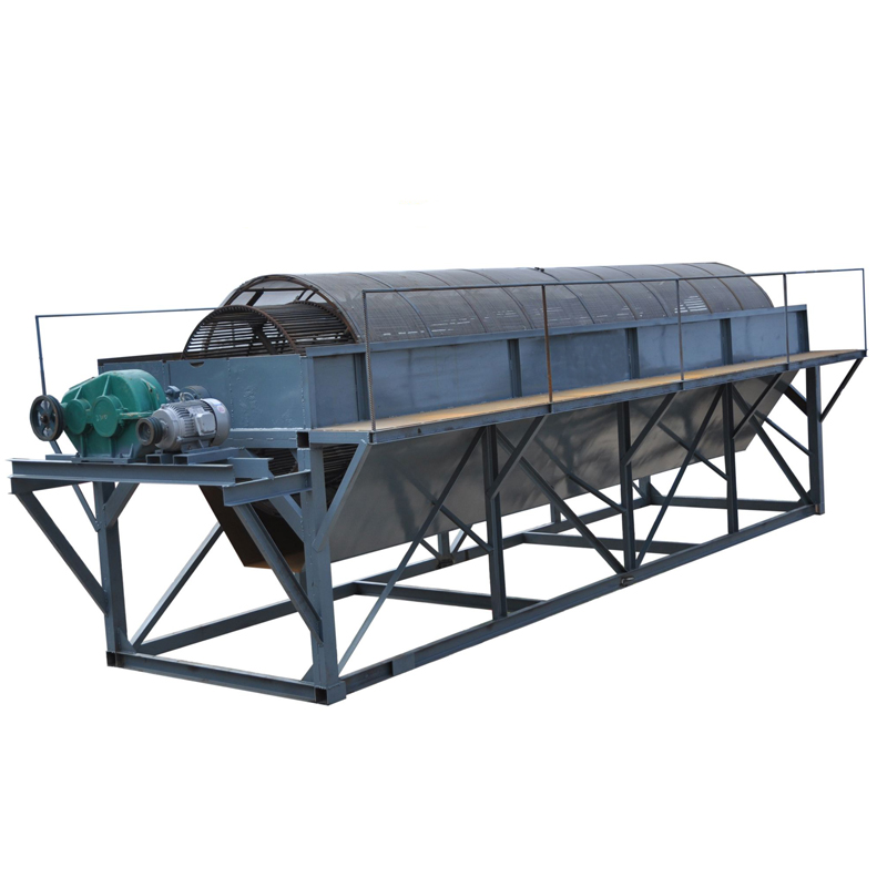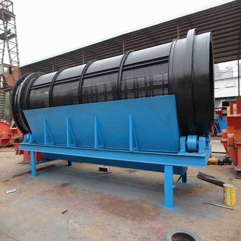 圆筒筛有滚筒、机架、漏斗、减速器、电机五个部分组成。矿物进入滚筒后,一方面随着滚筒转动而被筛选,另一方面粒度大的矿或石料沿着滚筒斜度向前溜走,通过不同的筛网逐渐被晒出,不大的石料筛出后落入个中漏斗,然后又人工运出或自流。