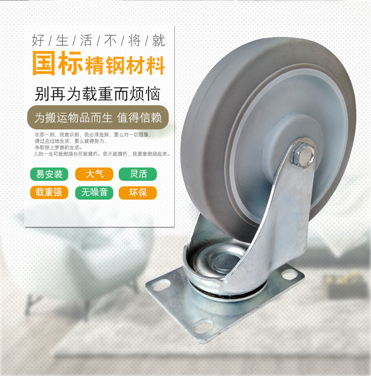TPU轮的特性,TPU轮的弹性体具备耐磨耗、耐化学侵蚀、高强度、高弹性、耐低压、吸震性强、耐撕裂,耐辐射,高承载和减震缓冲等良好性能。TPU同时具备较宽的硬度范围,从邵氏A10-100.TPU轮的这些特性,非常适合作为脚轮材料。