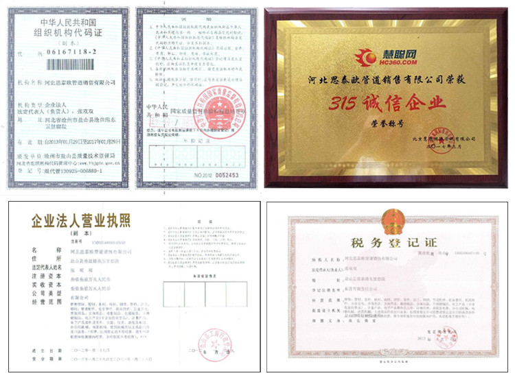 河北思泰欧管道销售有限公司是华北地区专业生产与销售钢管及管道配件的大型企业之一,座落在全国管道生产基地沧州市盐山县五里窑工业区 。距天津新港仅150公里,交通运输 为便利。公司占地面积3000平方米,注册资金330万元,现有员工80人,其中技术人员30人。我公司有完整、有效的质量管理和质量保证体系,公司现通过IS09001质量体系认证,API 5L、API 5CT认证,英国劳氏认证。公司工艺设备先进,检测手段齐全。拥有先进的检测设备:X射线探伤、超声波探伤、静水压试验机、拉伸试验机、金相分析仪、理化实验室和完整的检验系统。从而保证了产品的生产和检验符合标准要求,满足顾客需求。主要产品有:无缝钢管(热扩无缝钢管小口径无缝钢管)、焊接钢管(API 直缝焊管、直缝埋弧焊管)、镀锌管(无缝及焊接)、防腐(PE)钢管、无缝弯头、三通、异径管、管帽,高压承插管件、A105法兰(对焊、平焊、盲板、法兰环)等,产品销售到国内各大型热电、化工、电力等企业,并远销美国、意大利、德国、马来西亚、泰国、韩国、科威特、捷克、印度尼西亚、香港、印度、伊朗、巴基斯坦、智利、巴西、新加坡等国和地区。公司凭借雄厚的资金实力、先进的管理经验、优良的销售服务、严格的质量管理体系和科学的整体营销手段,与您携手并进,共同发展。公司将以"诚信为本、客户至上"为原则,以好的质量,低的价格,完善的售后服务,来答谢新老客户。我们真诚希望与您建立长期的合作关系,互惠互利,共同发展