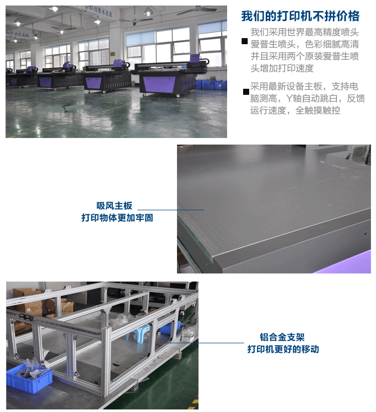 | 定 义 | 把原装爱普生打印机的机头拿来,去掉下面的进纸或者卷材信号,改成平板的直行信号,在主板上加上UV灯、直行信号等程序 | 用到爱普生的原装喷头,其他如主板、 软件、色彩管理系统、机架设计全由自 主研发,程序可扩展。 |