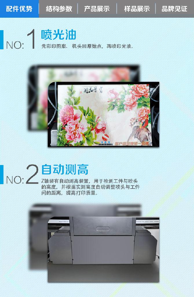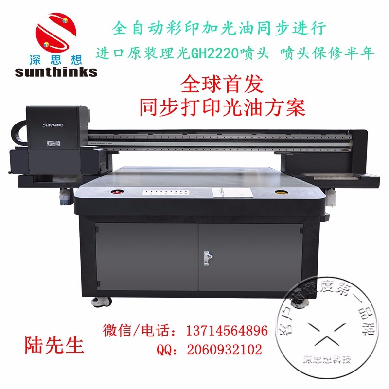 一、UV打印机更新技术: UV打印机全彩图像一次完成,渐变色完全达到照片效果,定位**,废品率为零,节省了大量人力、物力。 UV打印机实现了真正的无版印刷,单张与批量加工的成本一致,您可以经济高效地完成中短版活件,帮助您增加更多商业机会和利润。补充了传统网印工艺的不足,不仅用于小印数的活件,还可用于打样或模拟图象的效果,客户能从多种工艺中选择**适合需要的技术。设计、生产过程简单,甚至可单人操作,满足客户立等可取的交付需求。 二、UV打印机更高精度: 该设备采用日本进口原装理光全新GH2220喷头嘴喷头、微压电喷墨技术是由精工爱普生开发的**技术。它将许多微小压电陶瓷放置到打印头喷嘴附近,压电陶瓷在两端电压变化作用下具有伸展或收缩形变的特性,当图像信息电压加到压电陶瓷上时,压电陶瓷的伸缩振动将随着图像信息电压的变化而变化,并使喷头中的墨水在常温常压的稳定状态下,有效地控制墨滴的大小及调和方式,均匀准确地喷出墨水,从而获得高精度和分辨率的图像彩色打印输出,同时降低了墨水的消耗量。 三、UV打印机更广泛应用: 该设备印刷材料广泛,柔性介质如:反光膜、油画布、地毯、皮革等;硬性介质如:玻璃、木制工艺品相框、天花板、铝板、木板、门板、亚克力板、有机玻璃板、雪弗板、瓦楞纸板,塑胶板,树脂板,石膏板等;各种产品外壳介质如:MP3音乐播放器外壳、照相机外壳,蓝牙耳机外壳、手机外壳、冰箱外壳、笔记本电脑外壳等。 四、UV打印机技术保障: UV打印机的打印结构:采用吸附式介质固定平台,材料静止不动,依靠吸附和压辊保持平整度丝杠带动打印横梁移动,实现打印步进。平台结构与皮带结构和压轮结构相比,更适合厚重、大尺寸的板材打印。 UV打印机机头自动升降:自动升降功能保证在100mm的高度内准确地根据材料厚度调节打印高度。