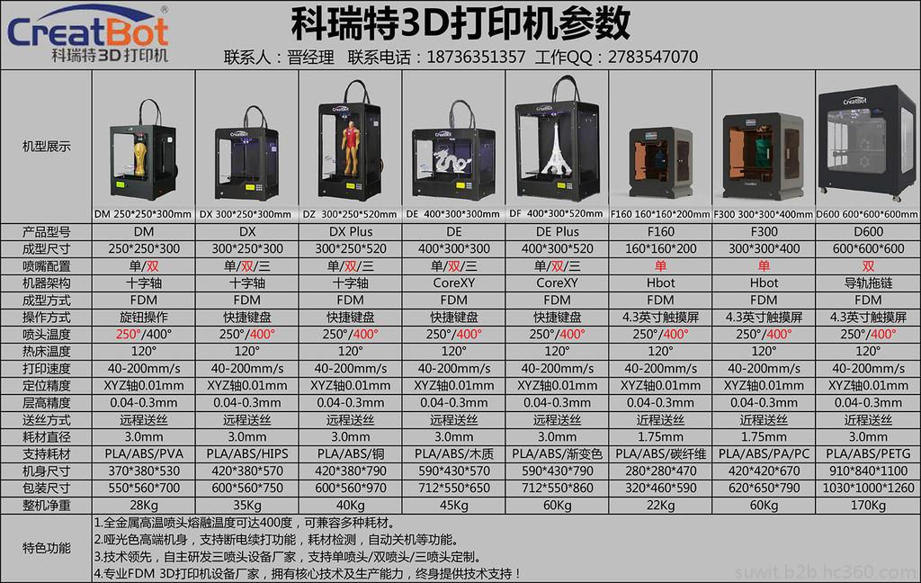 CreatBot/科瑞特3D打印机3D打印机整机相关参数