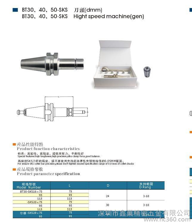 深圳市鑫巢精密五金有限公司是一家高新科技企业,主要从事五金模具各类机械配件产品研制,开发,销售。自主创新,以市场需求为导向,以不断创新为理念,先后开发出:SKS刀头.SKS轴承扳手型.加长柄刀头.标准测试棒.防导磁寻边器(分中棒).防震刀杆.螺纹锁固式刀杆.方刀把日本胶质螺丝.扳手.螺丝.弹簧夹.铣刀 等多顶**产品。 本公司产品与日本大昭BIG.尼肯产品同等级别,目前国内**能与瑞士肖柏林通用产品。进口材质,性价比高 ,获多家大型企业认可及好评。