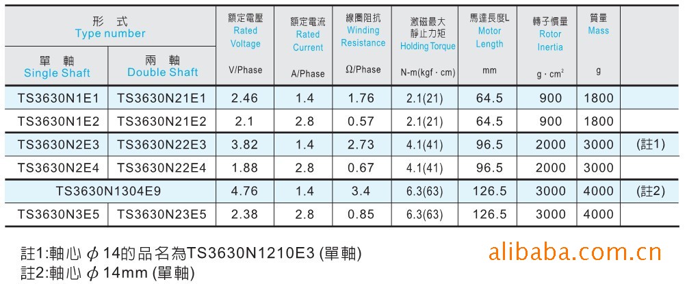 注1:轴心Φ14的品名为TS3630N1210E3【单轴】