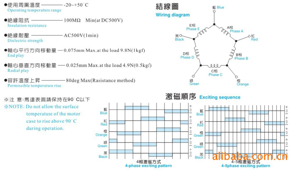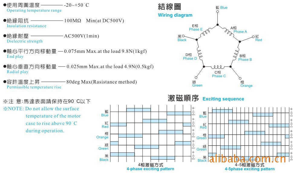*使用周围温度【-20-+50°C 】 *轴心垂直方向移动量0.025mmMax. *绝缘阻抗100MΩ *容许温度上升80degMax *绝缘耐压AC500V *轴心平行方向移动量0.075mmMax.***注意:马达表面请保持在90°C以下.