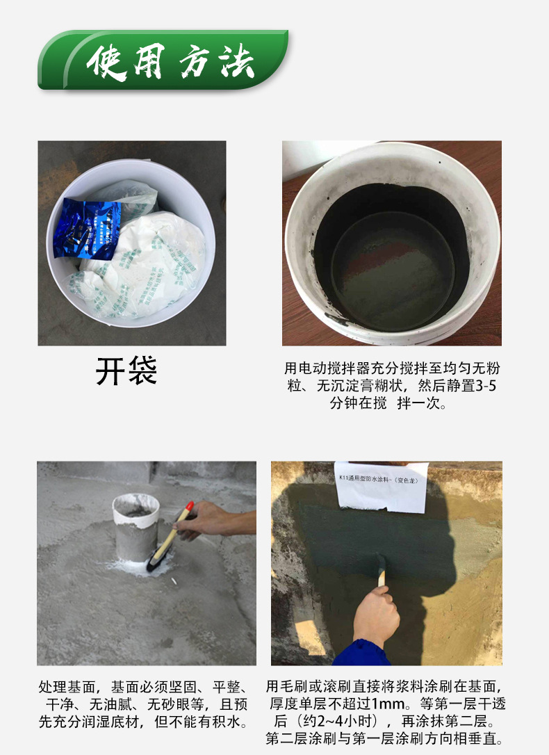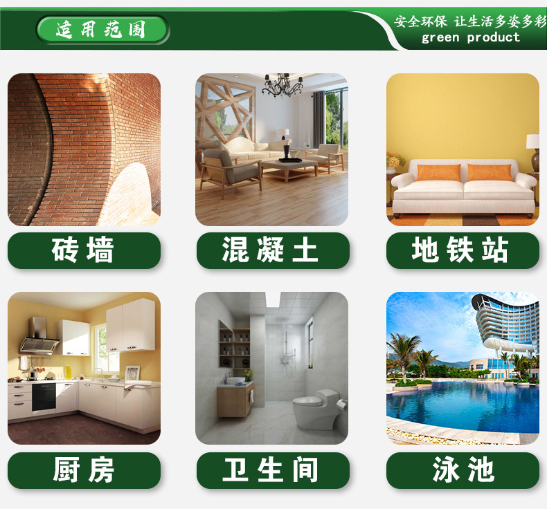 | 用途范围 | 可以用于混凝土、砖墙、混凝土砌块、预制块等各种建筑结构的室内外防水工程,如:地铁站、矿山、隧道、电梯 |