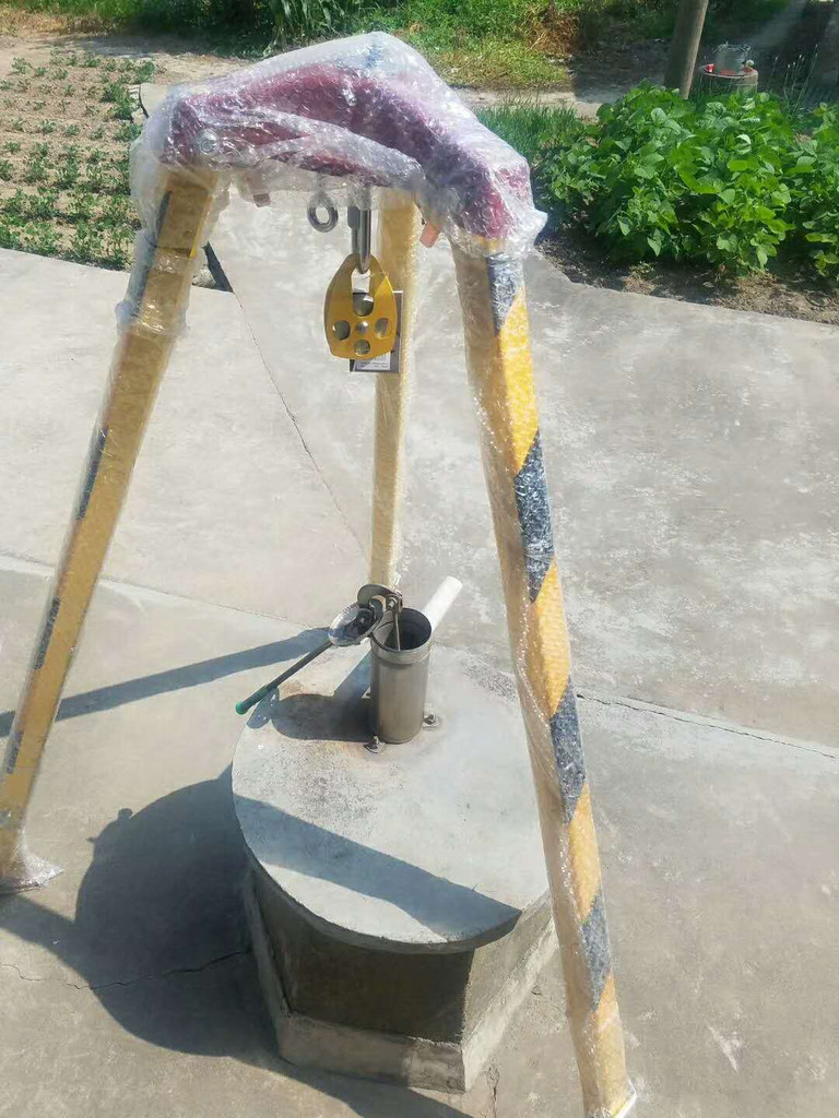 4、方便的装配,可因地制宜的装置在井口、坑口、且不受地面高低不平的限制。采用高强度轻质合金制造的可伸缩支脚,安全系数大于10,底脚设有环型保护链;