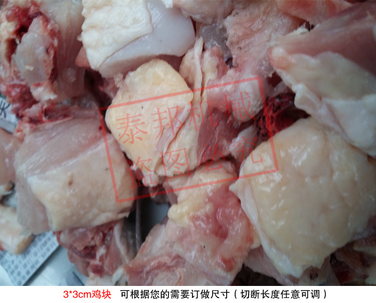 本机适用于鸡、鸭肉、中小型动物骨头、排骨、冷冻肉、鲜肉、冻鸡、鸡腿等加工设备,可根据需要剁块、段、条等形状大小可调。