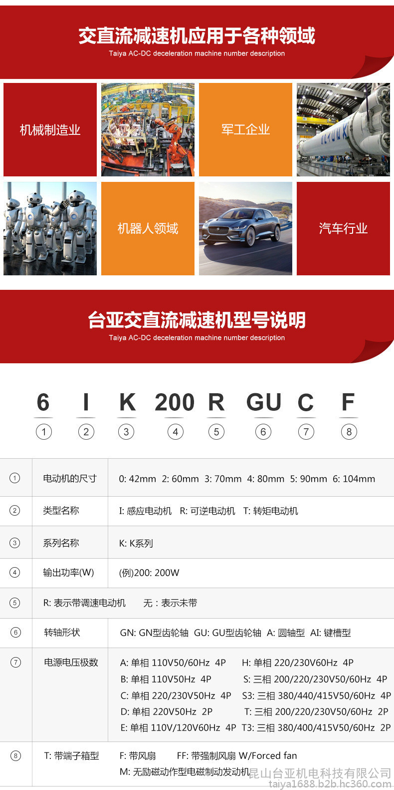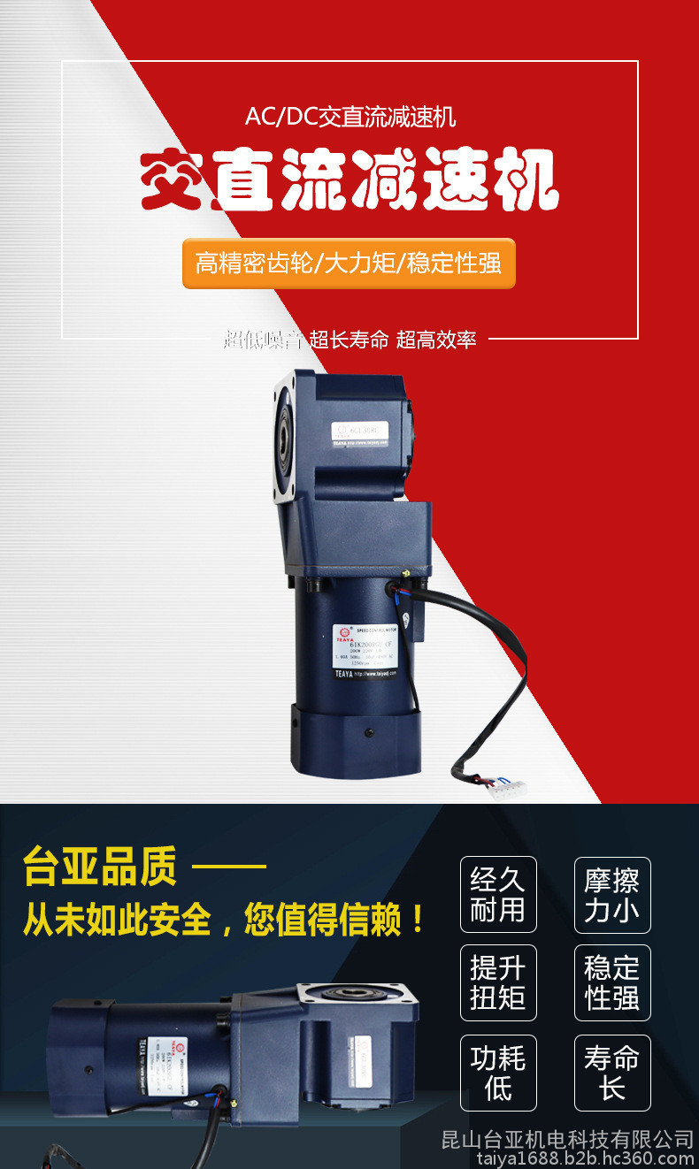 昆山台亚机电科技有限公司是减速机、变速机、方型减速机、硬齿面系列、台亚PC配蜗轮蜗杆减速机 台亚PC配方形、NMRV减速机、微型电机、马达、控制器、齿轮减速机、斜齿轮-准双曲面齿轮减速机、8000系列摆线针轮减速机 、行星减速机、伺服减速机、 YX3系列等节能电机、防爆电机 、伺服电机、步进电机、普通电机、变频器、 十字转向器、 升降机等产品生产加工的公司,拥有完整、科学的质量管理体系。昆山台亚机电科技有限公司的诚信、实力和产品质量获得业界的认可,坚持“只有得到客户信赖,生意才会兴隆”的原则为广大新老客户提供**的服务。我们将竭诚为您服务!欢迎各界朋友莅临参观、指导和业务洽谈!