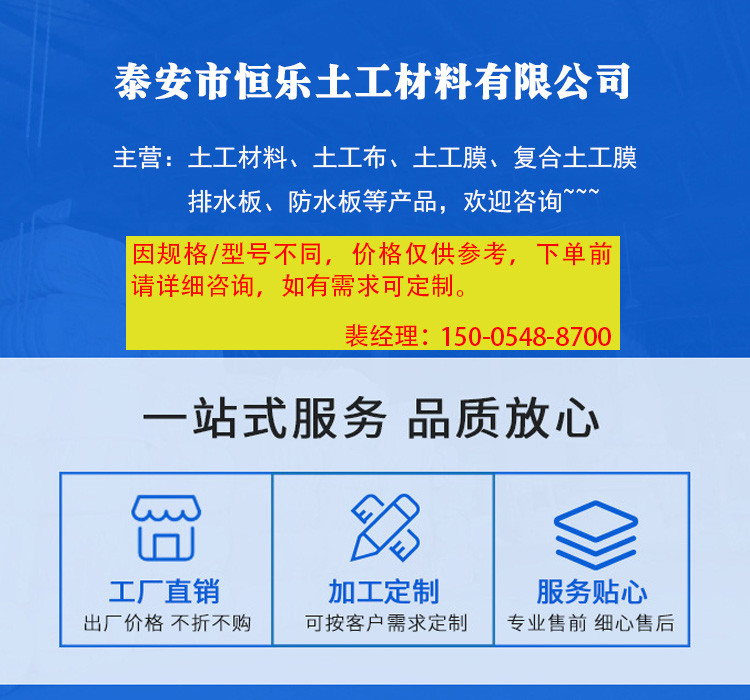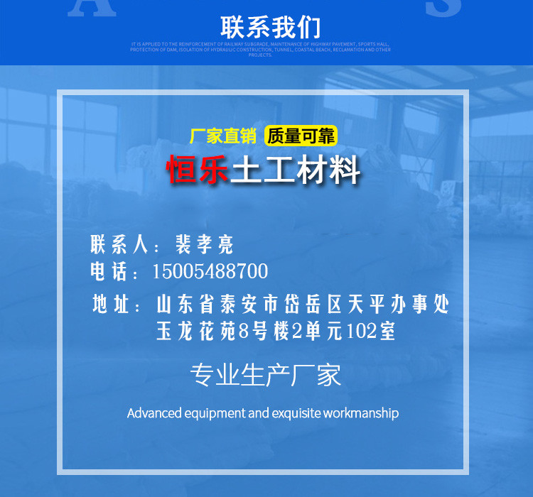 泰安市恒乐土工材料有限公司注册地址位于山东省泰安市岱岳区天平办事处玉龙花苑8号楼2单元102室,注册机关为泰安市岱岳区市场监督管理局,法人代表为程娇娇,经营范围包括土工合成材料、工程材料、塑料制品、建筑材料、环保材料、环保设备的销售,园林绿化工程、水利工程、市政道路工程、防水工程的设计与施工,建筑施工劳务作业服务。