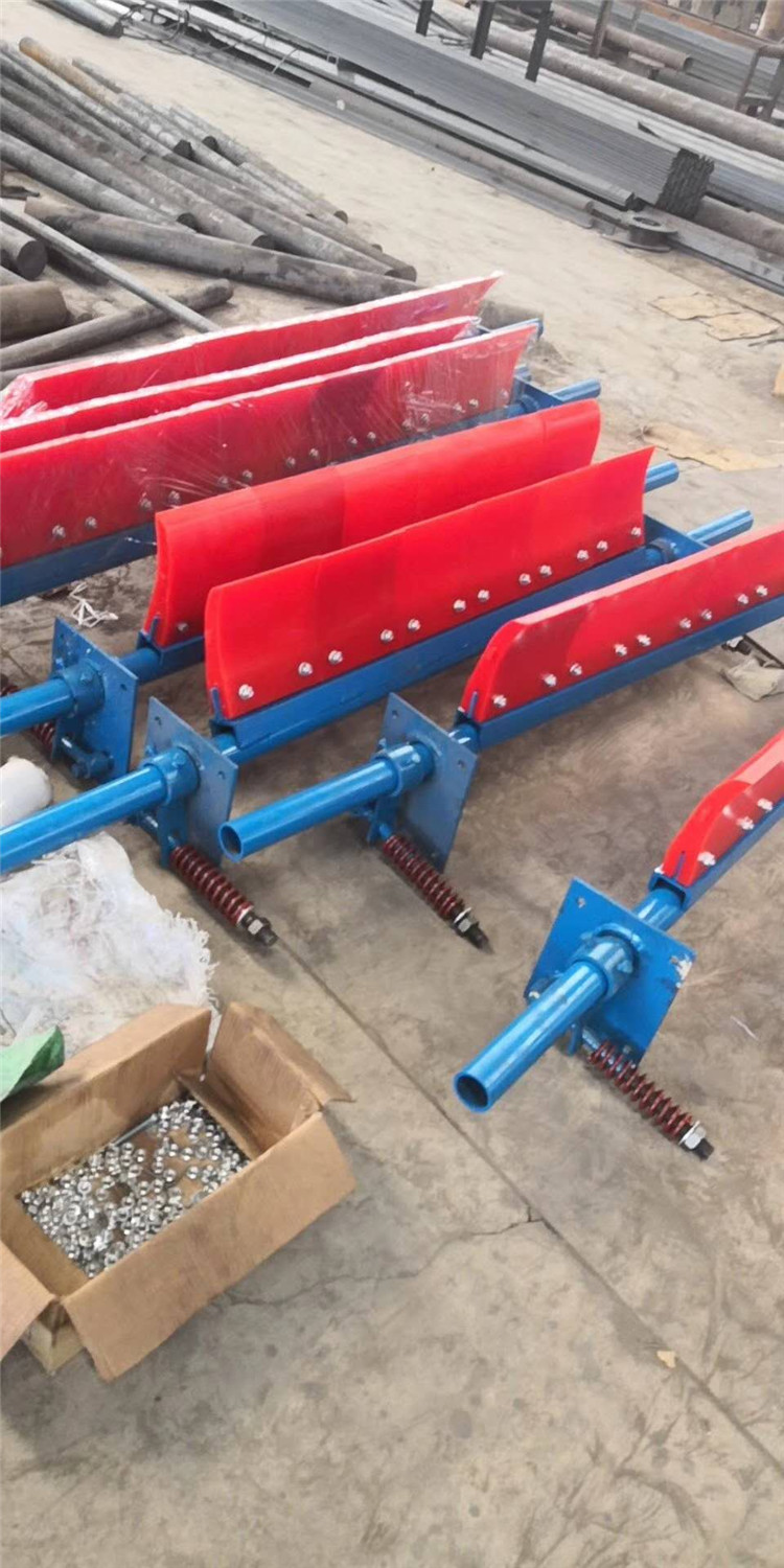 H型合金橡胶清扫器安装于头部卸料滚筒处,清除输送带上的粘附物料,完成一次清扫。