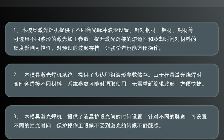 通发激光国内率先推广国产国产模具激光焊机,TFL-200Ⅲ升级型世界500强选用,针对精密塑胶模具激光焊、镜面塑胶模具激光烧焊、精密压铸模具激光焊补.为国内模具修复行业做出巨大贡献。