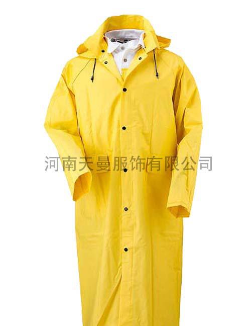 涤纶面料,30MM PVC涂层;可用四合扣扣上雨帽或用帽绳固定,两个前下带盖兜,前门襟四个四合扣。