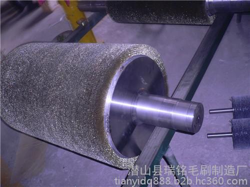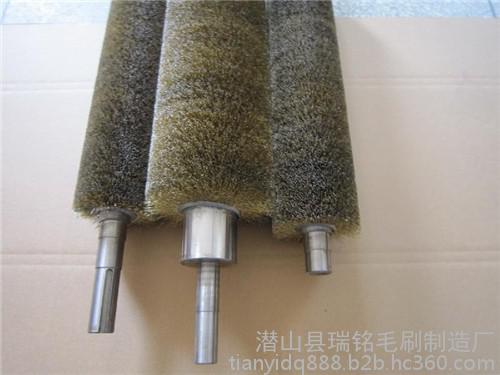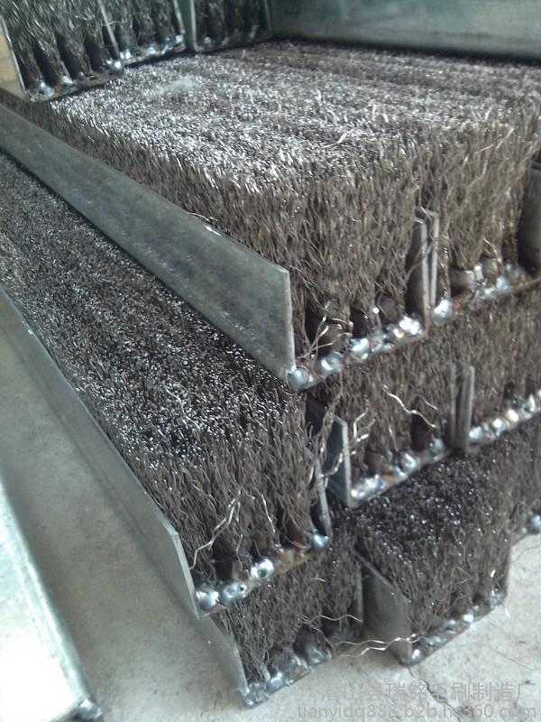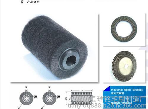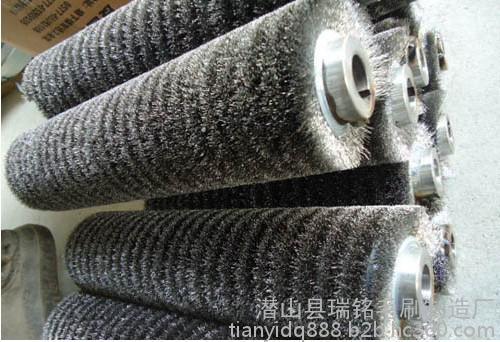 钢丝刷特别是钢丝刷辊通常应用于钢材或铝业表面处理厂,由一系列 的不锈钢丝刷辊安装在全自动高速运转的毛刷抛光机(刷光机)上。钢丝刷辊以与轧件运动相反的方向在板带的上下表面高速旋转刷去氧化铁皮。刷掉的氧化铁皮采用封闭循环冷却水冲洗系统冲掉。一般卷线材的使用厚度为1.09-6.35mm,钢丝刷子的更新周期为每生产2万t薄板或4万t钢卷更新一次。