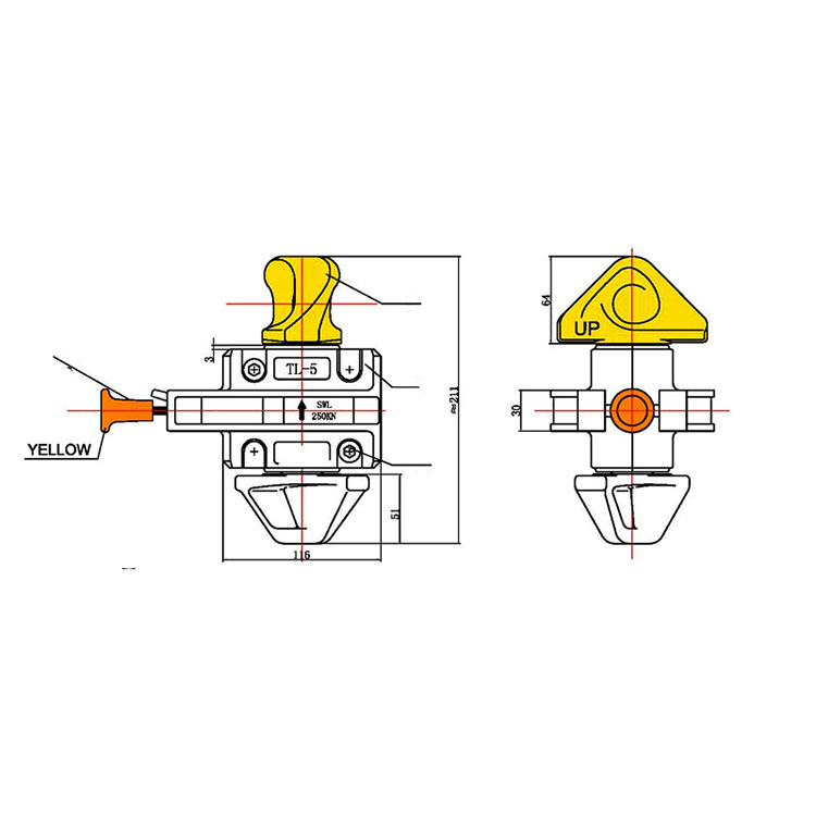 半自动扭锁是在码头上当桥吊将集装箱吊起至人手臂举起的高度时,从下向上将其插入集装箱角件孔内,待吊上船并对立式底座或另一集装箱角件孔时放下,该锁的自动装置即起作用并转动锁轴将箱与底座或箱与箱连接锁紧。