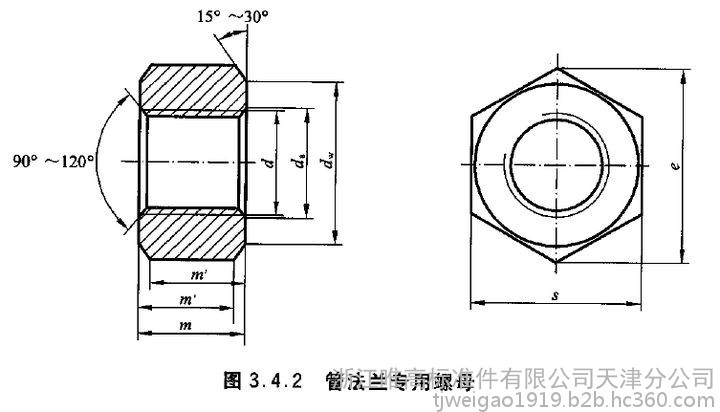 3、螺母:与六角螺栓配合使用的螺母型式应符合GB/T6170的要求;与全螺纹螺柱配合使用的螺母(管法兰专用螺母)为加厚螺母。