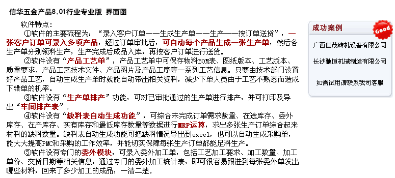 2、管理好企业从接单、下生产单到生产订单完成全过程的跟踪管理。让企业管理者很容易**了解到每张订单生产进程、生产单完成情况。