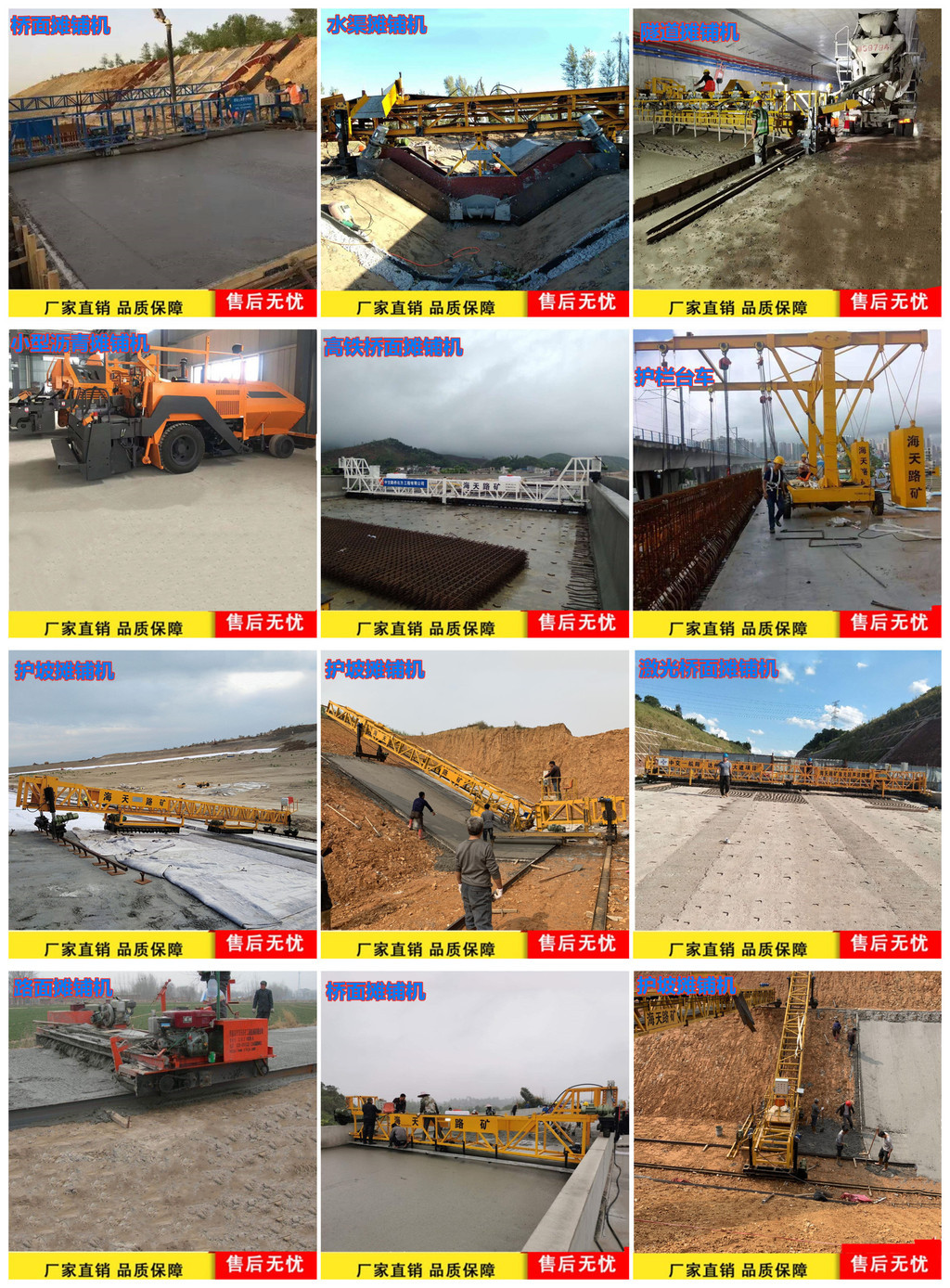 本企业通过ISO9001:2001质量体系认证     秦皇岛市海天路矿工程机械有限公司是路面、桥面、隧道、路缘石、水泥摊铺机的生产企业,坐落在举世闻名的旅游胜地秦皇岛市开发区,具有良好的地理位置,铁路、公路交通十分方便,并在四川中江设有分厂。本公司是从事筑路机械、建筑基础工程机械的专业制造商。主要产品有水泥混凝土摊铺整平机、水渠摊铺机、滑模摊铺机、水渠护坡布料机、桥面摊铺机机、路缘成型机、切缝机、护栏模板台车、驾驶式抹光机等。     本公司产品多年来销往世界各地,俄罗斯、蒙古国、巴基斯坦、印度、泰国、非洲、北美、朝鲜地区。     网页发布的图片只作为参照资料,由于技术的改进产品随时更新以交货为准.