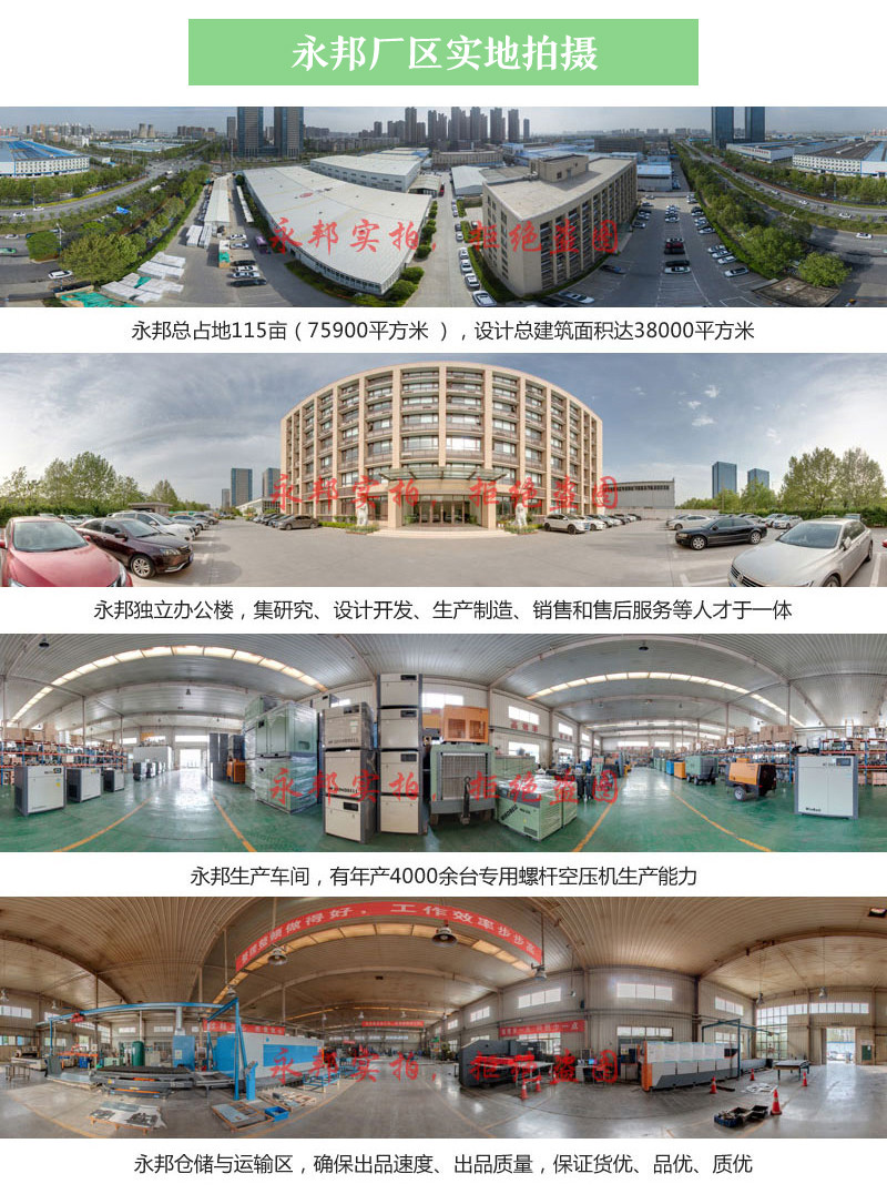 永邦空压机是一家以螺杆空压机、永磁变频空压机、两级压缩空压机、移动式空压机、特殊定制空压机及干燥机、储气罐等节能产品的研发设计、生产制造、销售和服务于一体的高新技术企业。
