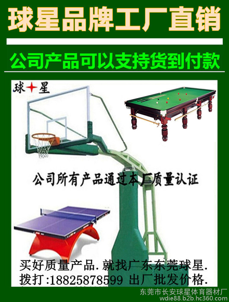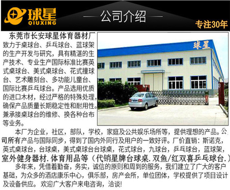 东莞市长安球星体育器材厂集三十多年管理、制造经验,专业制造桌球台、乒乓球台、篮球架、桌上足球.公园.小区健身器材等./等体育用品。秉着质量至上,信誉好的原则,所做产品深受客户好评。桌球台、乒乓球台、篮球架.桌上足球.公园小区健身器材五个系列产品远销欧洲,南、北美洲,澳大利亚及部分阿拉伯国家。