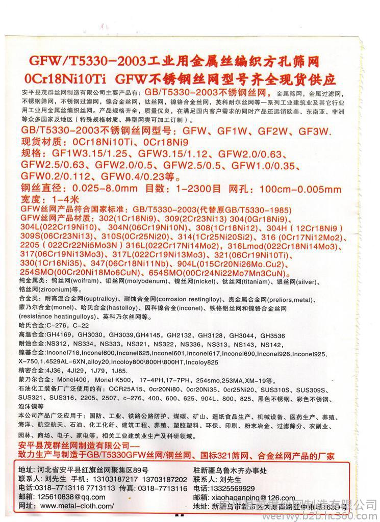 茂群丝网+GB/T5330-2003+321GFW不锈钢丝网、金属丝网、方孔筛网、方孔丝网、筛网、编织网、过滤网、金属网安平县茂群丝网制造有限公司主要产品有:GB/T5330金属丝网,金属筛网,不锈钢轧花网、金属过滤网,不锈钢丝网,不锈钢筛网,不锈钢过滤网,镍合金丝网,钛丝网,镍铬合金丝网,英科耐尔丝网等一系列工业建筑业及其它行业用工业用金属丝编织丝网。产品规格齐全,质量优良,在满足国内客户需求的同时产品还远销欧美、东南亚、非洲等众多**及地区(特殊规格材质、异型网类可加工订制)。