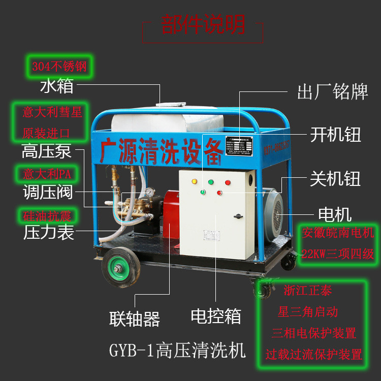 二、质量优异:广源机械GYB系列清洗机出厂前,严格按照**标准GB/T7784-2006《机动往复泵试验方法》和行业标准JB/T6909-1993《超高压泵》来生产和检验的,额定压力下24小时连续运行,无漏水、无漏油、无高温。