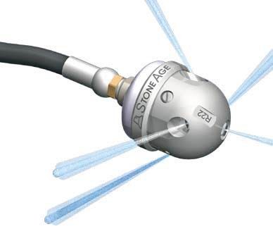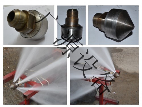广源清洗机附件——旋转鼠头:该复合旋转喷头能把管道和横连接进行很好的冲刷清洗,使用两个90°角辐射喷嘴清洗管壁,两个45°角半后辐射转力喷嘴提供向前动力。旋转是有钻在哑铃型轴上的旋转体上的小孔和所装喷嘴的喷射的反射力驱动产生,如果无阻力,转速可达每分钟数千转。