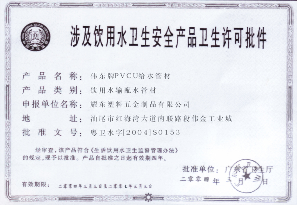 顏色:偉東PVC-U飲用水管材管件的顏色通常是白色。也可按用戶要求生產其它顏色。