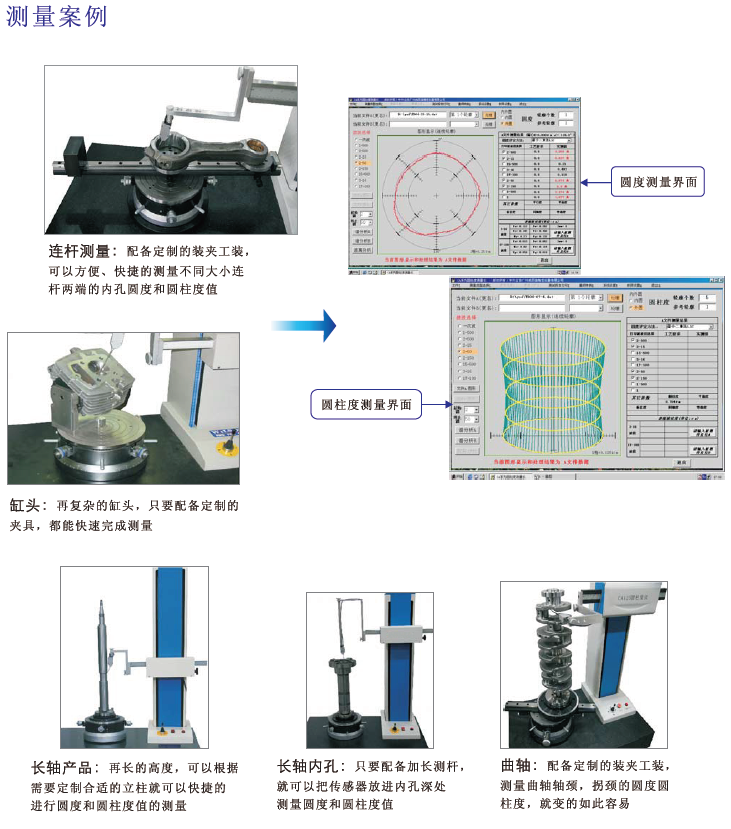 可测环形工件的圆度、表面波纹度、频谱分析、波高分析、同心度、同轴度、垂直度、平行度、平面度及轴弯曲度等。