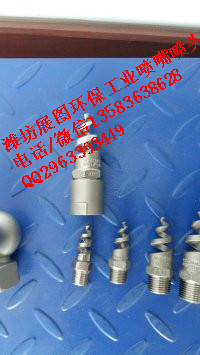 螺旋喷嘴又叫脱硫喷嘴、防堵塞喷嘴、大流量喷嘴、除尘喷嘴、耐腐蚀喷嘴,是一种实心锥形或空心锥形喷雾喷嘴,喷流角度范围可为50°-170°。[2]错误!未指定文件名。,液体流率范围为5.5-4140升/分。这种结构紧凑的喷嘴有着畅通的流道可以最大程度地减少液体阻塞,使液体在给定尺寸的管道上达到最大流量。