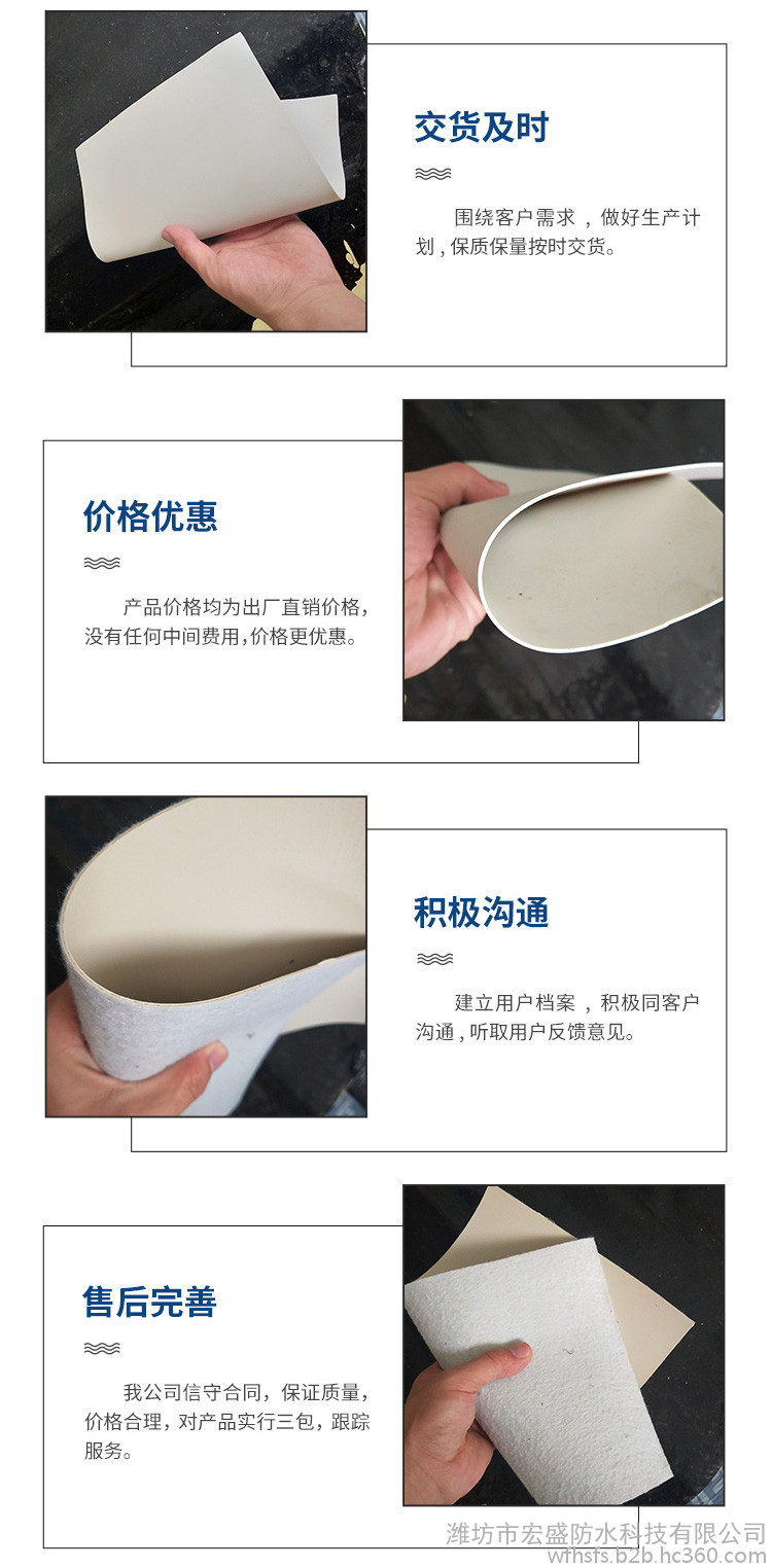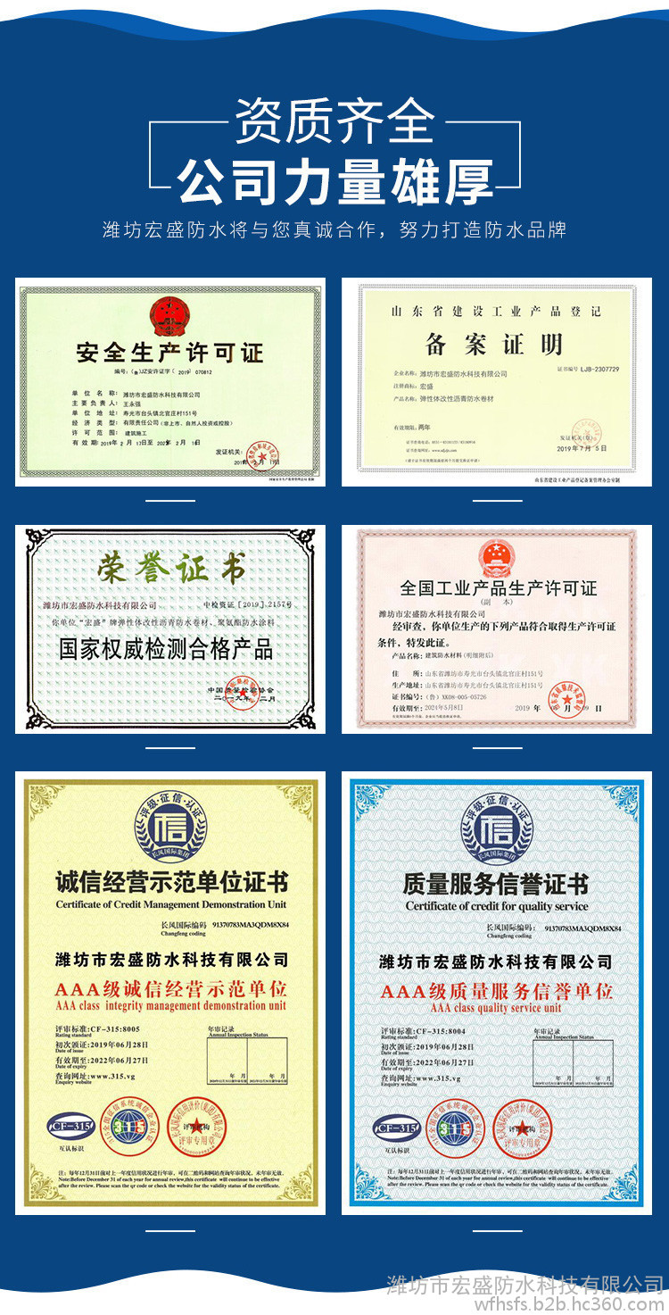 公司主要生产销售弹性体/塑性体(SBS/APP)改性沥青防水卷材、聚氯乙烯(PVC)防水卷材、高分子丙(涤)金属胎耐根穿刺防水卷材、聚乙烯丙纶复合防水卷材、高分子HDPE非沥青基自粘胶膜防水卷材、强力交叉膜自粘橡胶沥青防水卷材、高分子EVA板自粘橡胶沥青防水卷材、高分子丙(涤)纶自粘橡胶沥青防水卷材、高分子铝箔自粘橡胶沥青防水卷材、聚氯乙烯(PVC)内增强防水卷材、道桥用聚合物改性沥青防水卷材、TPO防水卷材、氯化聚乙烯防水卷材、高分子三元乙丙橡胶防水卷材,EVA防水板等产品,聚氨酯防水涂料、高铁专用聚氨酯防水涂料、JS防水涂料、高分子丙烯酸防水涂料、聚合物水泥基型JS防水涂料、水泥基渗透结晶防水涂料等等。产品规格齐全,性能稳定。广泛应用于各类民用建筑、地铁、隧道、水利环保工程、垃圾掩埋场、化工、冶金等多个领域的防水防渗、防腐工程。是集生产、科研、施工、销售于一体的专业化企业。