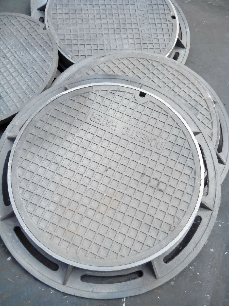(1).生铁:每批生铁进厂必须进行检测,合格后方可入库,如不合格拒绝使用。 (2).检测频次:30吨以下每批三个样品,30吨以上每批五个样品。 (3).回炉料:为了确保产品质量稳定,回炉料的投放严格控制在30%的比例之内。 2.熔炼方法(球墨铸铁井盖、井圈) (1). 1.5吨双频电炉熔炼:出炉温度在1400--1500℃ (2). 每包铁水重量:1500kg/包 (3).稀土镁合金加入量1.4%-1.6% 3.控制方式 (1).每包铁水球化之前检测一次出炉温度,控制范围1400-1500℃。 (2).每包铁水球化完毕后,检测一次铁水温度,控制范围在1360℃以上。 (3).每日进行原铁水1—2个样品的五元素检测,用以控制铸件材质及炉料回收使用的稳定性。 (4).每包铁水浇注控制时间为10分钟(球化反应后)超过此时间作为报废处理。 (5).每包铁水浇注完毕后,将事先预制标牌(上面刻有该包次的序号)插入该包浇注的铸件的浇口杯中,用以防止不同包次混淆。 (6).每包铁水浇注后期制作抗拉试棒毛坯,作为一个检验批次,做机械性能、金相组织及硬度的检测。 (7).落沙时,根据号牌分别堆放,不同包次不能混淆,等待试棒及金相的检测结果。 (8).试棒机械性能结果合格后,通知车间清理。发现不合格包次,依照标志牌号码逐个报废。 4.井盖的检验:严格按照检验标准执行。 (1).外观:无明显铸造缺陷,图案清楚,字迹清晰。 (2).平度检验:用专用胎具检验井盖的平度。 制作一个直径为产品尺寸,深度37mm的胎具,上述尺寸通过机加工而成,井盖放在胎具中,不能有晃动及响声,井盖不得高于胎具,深度(37mm)配合间隙在3mm。 (3).承重载荷采用抽检方式:在压力机做试压试验,井盖承压360KN或210KN确认合格批次。 5.井圈检验 (1).外观:无明显的铸造缺陷。 (2).用专用工具检测井圈直径,控制范围直径在井盖尺寸,深度40mm,螺栓孔要用专用检具逐检。 6.配合及喷漆检测: 井盖与井框配合组装要平,不晃动、无声响,盖与框高低配合不超过1mm。井盖(圈)喷漆均匀,无锈斑。