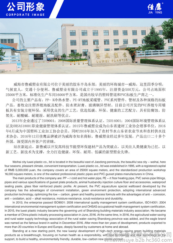 威海市鲁威塑业有限公司位于美丽的胶东半岛东部,美丽的环海城市—威海,这里四季分明,气候宜人,交通十分便利。鲁威塑业有限公司成立于1995年,注册资金500万元,公司占地面积25000平方米,标准化生产车间16000平方米,是国内较早的塑料管道和PVC扣板生产商之一。