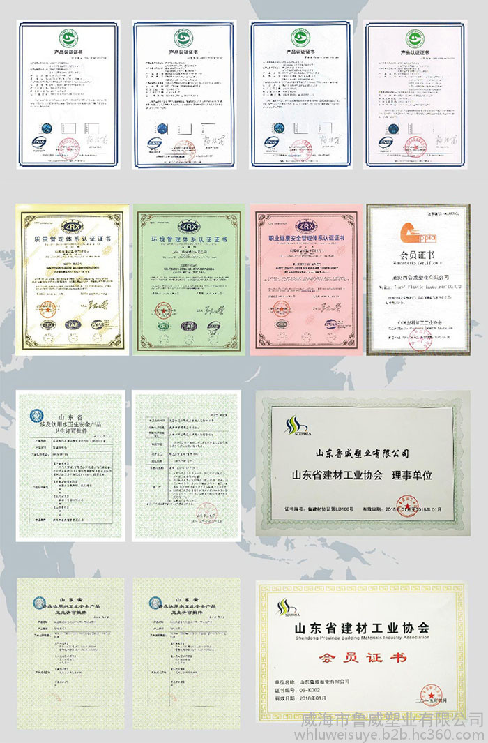 2013年企业通过了ISO9001:2008国际质量管理体系认证、ISO14001:2004国际环境管理体系认证及OHSAS18001职业健康管理体系认证。2015年鲁威塑业成为山东省建材工业协会理事单位。2016年6月成为中国塑料工业加工协会会员。同时2016年加入了农村节水山东省农业节水和农村供水技术协会。鲁威塑业经过多年发展,产品出口二十多个外国,深受国内外客户的青睐。