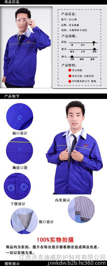 江西沃克迪威防护科技有限公司(原人和劳保)隆重推出的以职业工装为市场定位的全新专业工装,我们以展示企业形象、彰显员工风采为设计理念,全面帮助客户提升企业员工形象,丰富和完善VI内涵。公司创办于1998年,现有多条先进工艺生产流水线,全电脑衣车设备,客户遍布全国十八个省,在2010年“沃克迪威”品牌荣获“中国**品牌”称号,公司全面贯彻和实行了ISO质量管理体系,同时也是中国纺织服装协会会员企业。