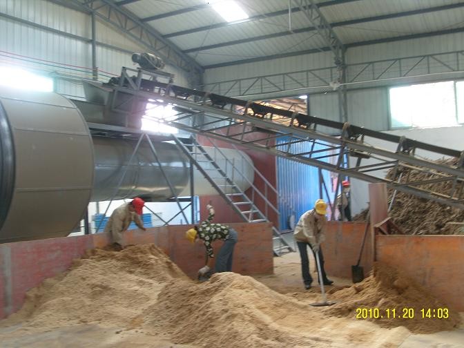 由于锯末烘干机(干燥机)采用上述结构,所以锯末能在旋转筒内充分干燥,且锯末在进入物料输送管前再次充分散开,使水分蒸发快,挡块可将锯末中的杂质挡住,保证进入物料输送管中锯末的质量。木屑进入木屑烘干机内由喷吹管与回转筒体共同作用,物料在筒内沸腾流化,热风与物料充分触,完成干燥。本实用新型纤维素类物料干燥设备具有结构简单、使用方便等优点,受到了广大客户的欢迎。