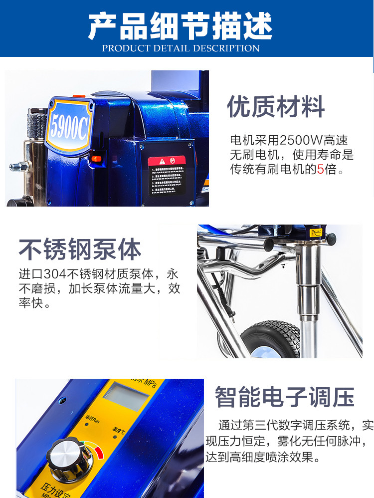 | 适用范围 | 中大型内外墙乳胶漆,涂料施工,船舶漆、彩瓦漆、环氧富锌、着色剂、清漆、瓷漆、工程翻新等 |