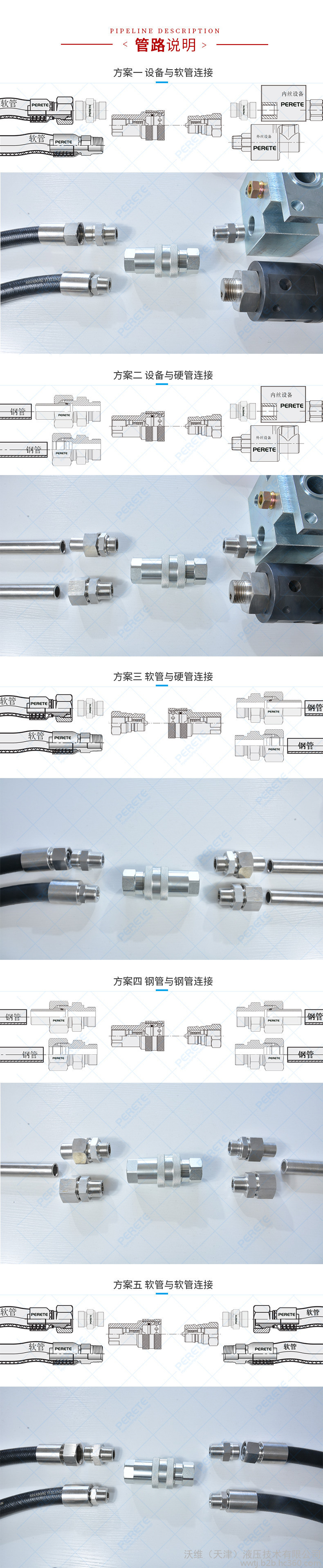 链接时:当子体插入母体时,套圈在弹簧的作用下回到原来的位置,钢珠滚动锁紧子体紧密连接,同时母体与子体的阀门互相推动而打开,流体流通,O型圈能完全阻断流体的渗漏。