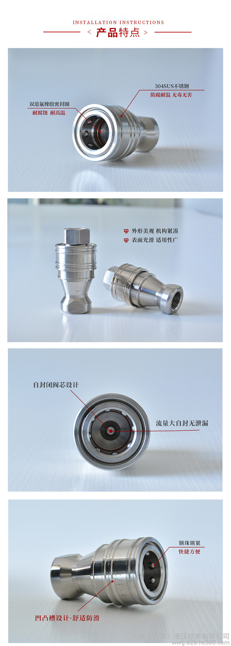 2、省油:折断油路时,快速接头上的单向阀可封闭油路,油不会流出,避免油液、油压损失。 3、环保:快速接头折断和连接时,油不会洒漏,保护环境。 4、设备化整为零,方便运输:大型设备或是需要便于携带的液压工具,使用快速接头分拆后运输,到达目的地后再组装使用。5、经济:以上各种优点都为客户创造了经济价值。